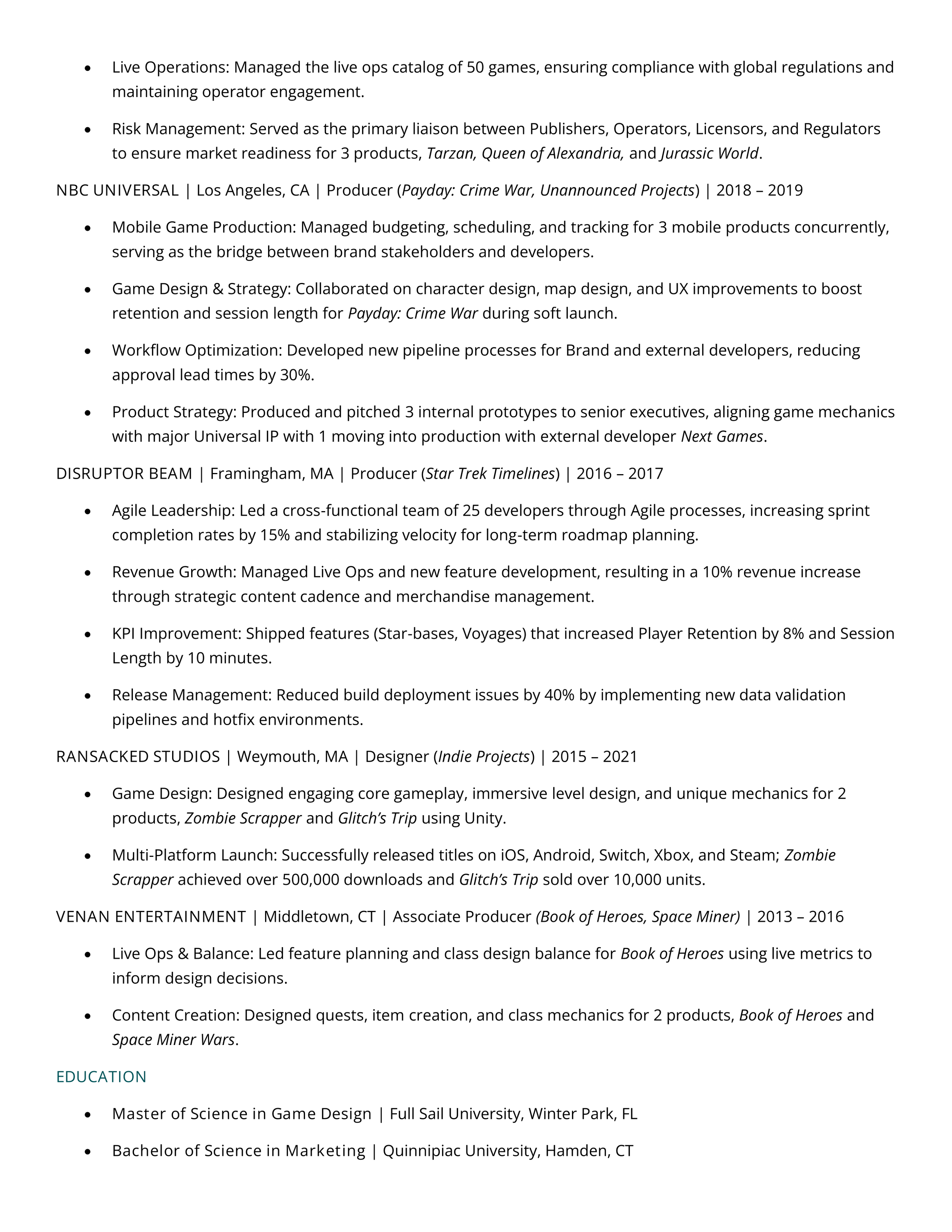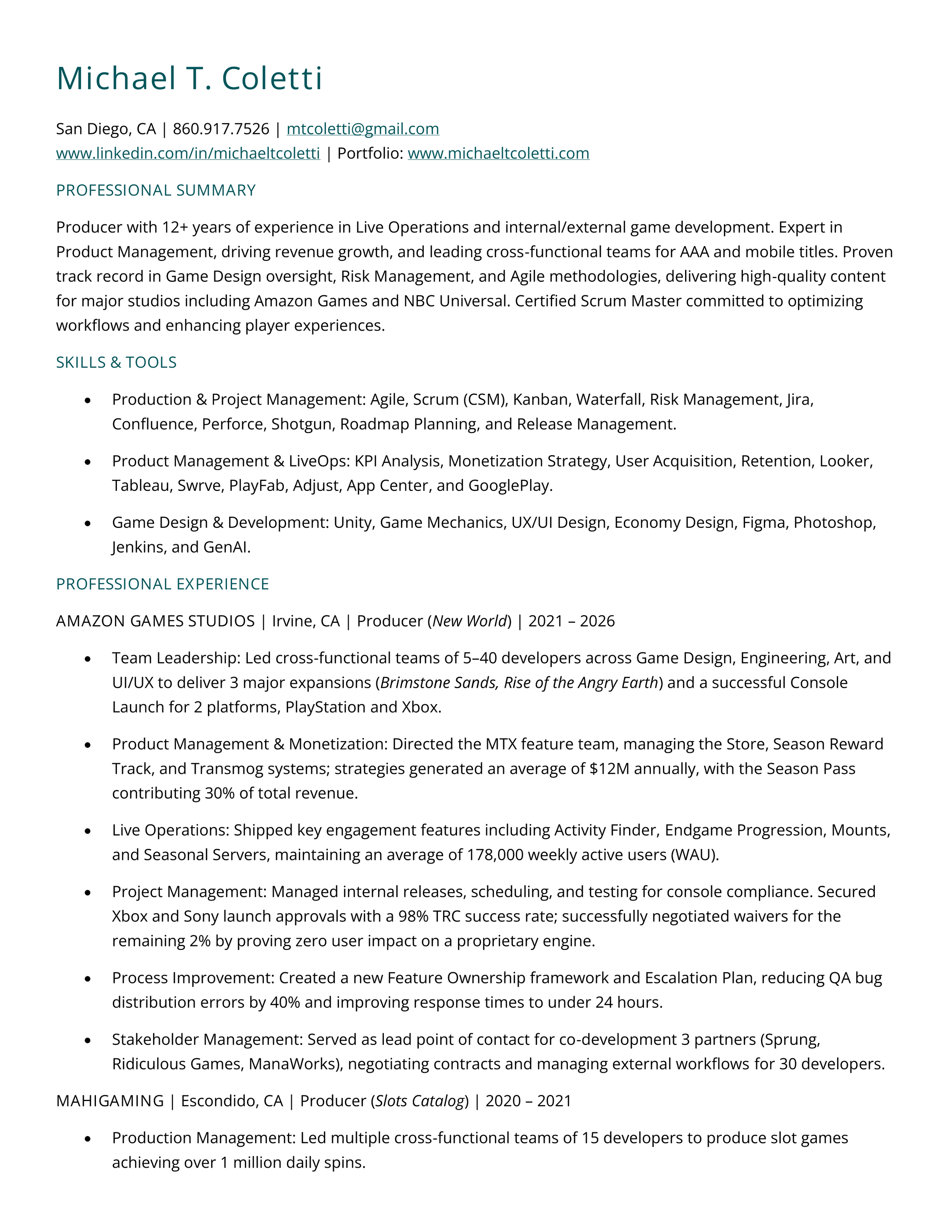 Agile, Scrum (CSM), Kanban, Waterfall, Risk Management, Jira, Confluence, Perforce, Shotgun, Roadmap Planning, and Release Management.